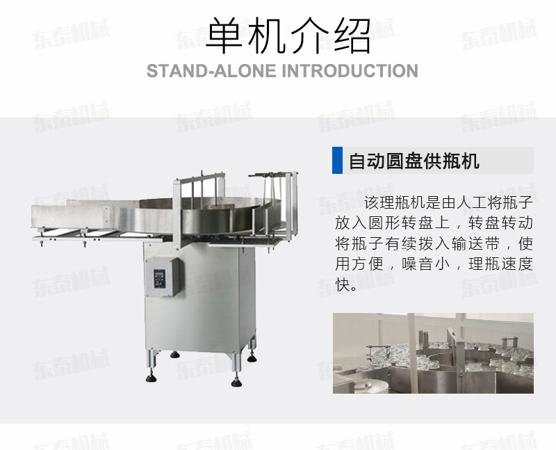 該理瓶機(jī)是由人工將瓶子放入圓形轉(zhuǎn)盤上,轉(zhuǎn)盤轉(zhuǎn)動將瓶子有續(xù)撥入輸送帶,進(jìn)入灌裝機(jī)進(jìn)行灌裝。使用方便,噪音小,理瓶速度快,操作簡單是不可缺少的一個環(huán)節(jié)。