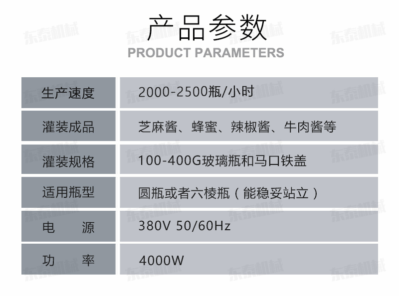 B、灌裝機(jī)采用橫推料的方式,縮短了下料斗到灌裝頭的距離,提高了灌裝速度,更重要的是解決了含油量大的物料在灌裝過程中出現(xiàn)的有的瓶油多,有些瓶醬多的灌裝難.,大大提高了灌裝精度。