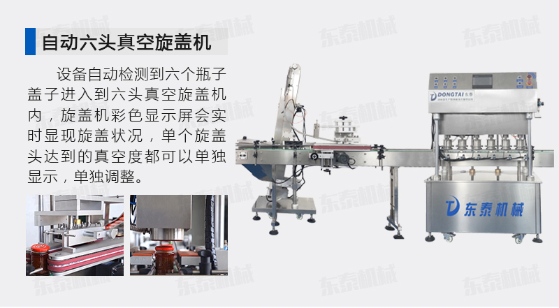 該直線式真空旋蓋機(jī)是東泰機(jī)械結(jié)合用戶使用的情況,摒棄了傳統(tǒng)轉(zhuǎn)盤式真空旋蓋機(jī)的弊端,研制開發(fā)的設(shè)備,設(shè)備自動檢測到六個瓶子蓋子進(jìn)入到六頭真空旋蓋機(jī)內(nèi),旋蓋機(jī)彩色顯示屏?xí)?shí)時顯現(xiàn)旋蓋狀況,整機(jī)多點(diǎn)檢測,當(dāng)進(jìn)口無瓶無蓋、出口堵塞、定位不準(zhǔn)、瓶身傾倒均自動停機(jī)。單個旋蓋頭達(dá)到的真空度都可以單獨(dú)顯示,單獨(dú)調(diào)整!