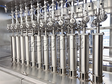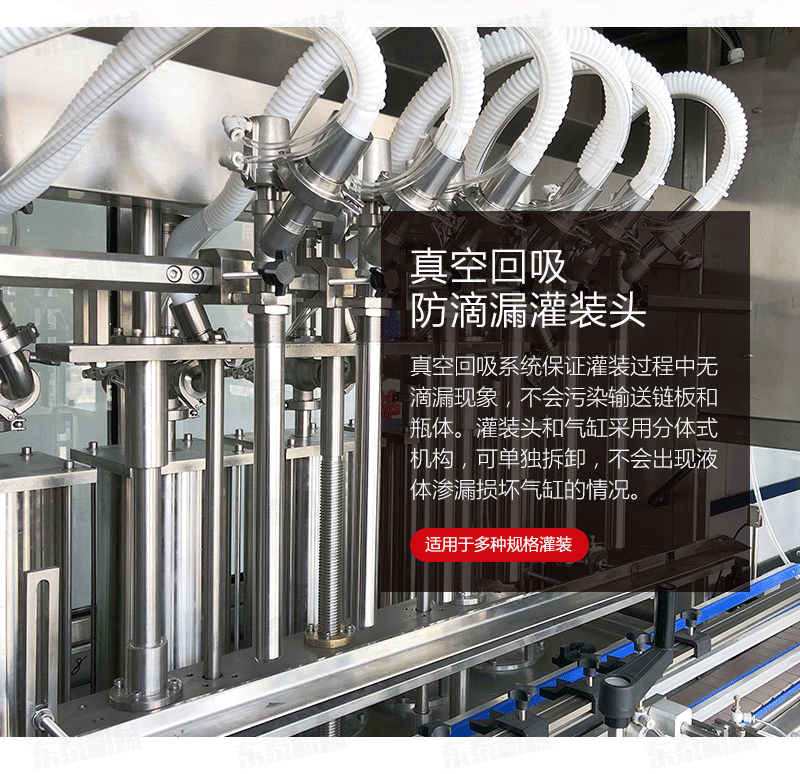 1.真空回吸系統(tǒng)保證灌裝過程中無滴漏現(xiàn)象,不會污染輸送鏈板和瓶體。灌裝頭和氣缸采用分體式機構,可單獨拆卸,不會出現(xiàn)液體滲漏損壞氣缸的情況。進口亞德客氣缸經(jīng)久耐用,其他密封等配件使用標準件,更換維護簡單方便。